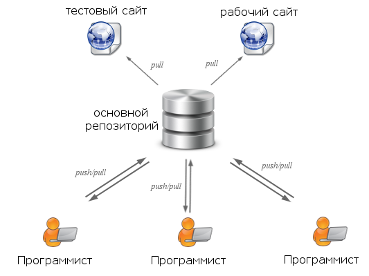 К примеру у нас есть тестовый сайт, рабочий сайт и группа разработчиков. Тогда работа с этими репозиториями будет выглядеть так: